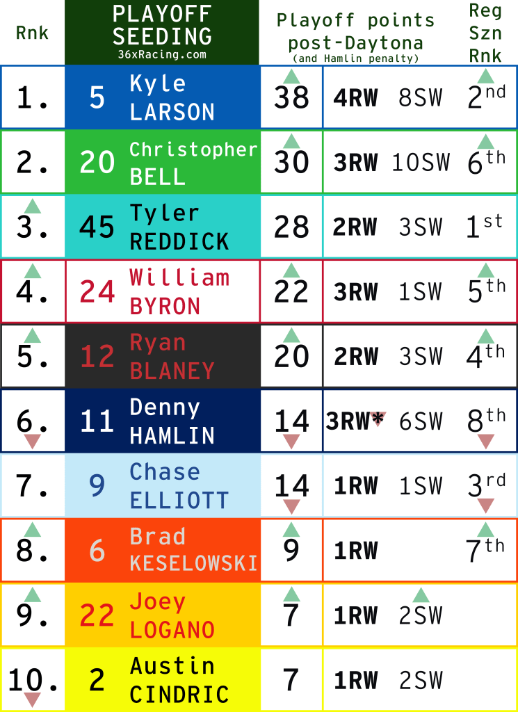 As Alex points out, this is very similar to the William Byron story. Byron had some better numbers heading into the win, but it does match well. The 100-125 start rule says that Harrison deserves a 2025 Cup ride, unfortunately seats are filling quickly. The SHR driver/charter market doesn’t seem to be working in Burton’s favor.