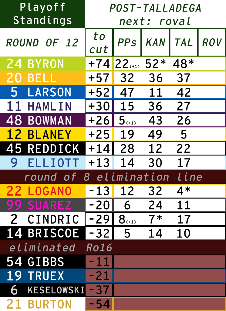 Denny Hamlin, Joey Logano, and Daniel Suárez were the only playoff drivers to not score stage points at Talladega. Hamlin was able to finish in the top ten, but Logano and Suárez were left with terrible points days. Logano and Suárez will need to be on attack at the Roval.
