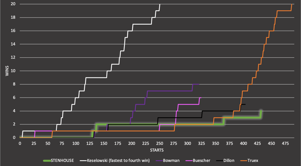 Ricky Stenhouse Jr. collected his fourth career win in his 431st start. Of the sixteen active drivers to tally four career wins, Stenhouse has taken the longest. The other drivers to take over 250 starts are Chris Buescher, Austin Dillon, and Martin Truex Jr.